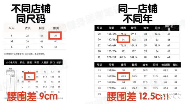 还有细心网友整理了某网店的女装尺码变化:同样是26码的标注,去年的腰围是74厘米,今年就缩水到了61厘米。